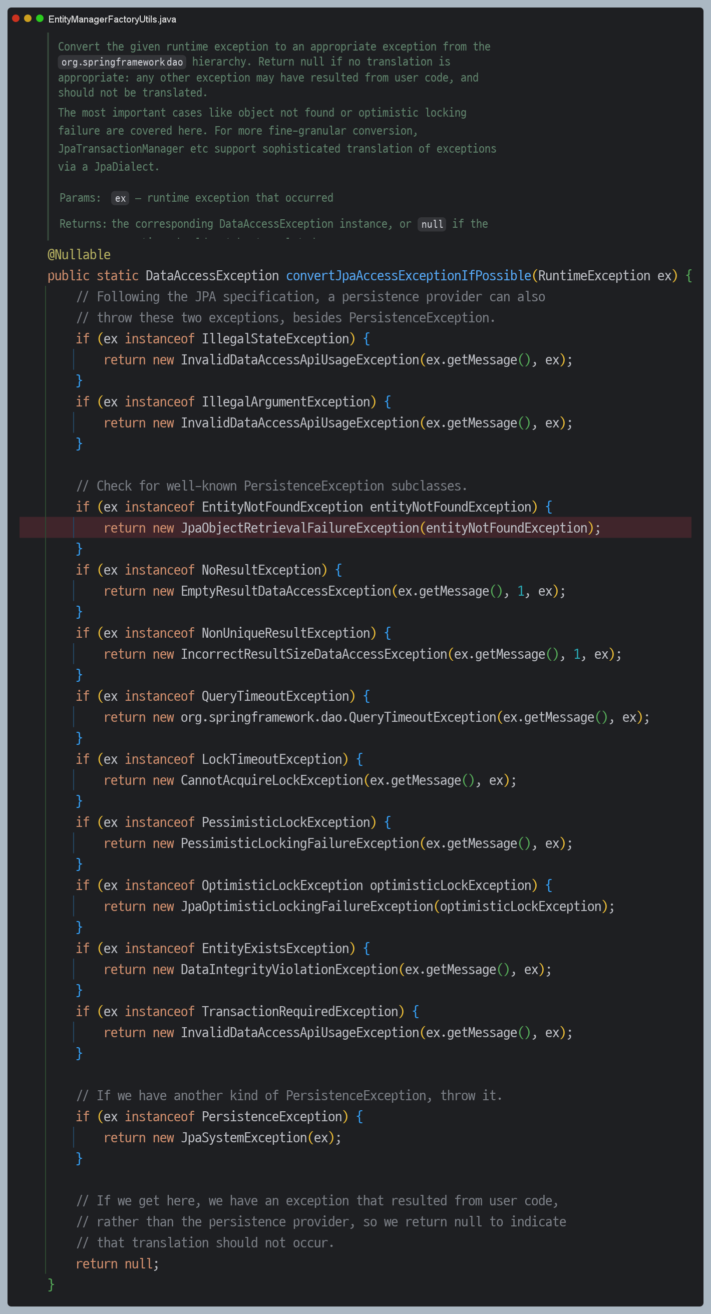 여기서 중요한 점은 `@Repository`는 데이터 계층 예외를 스프링 예외로 변환해주는 기능을 갖고 있다는 것입니다. 이 점을 유의한 채 `JpaObjectRetrievalFailureException` 클래스를 살펴 보았습니다.