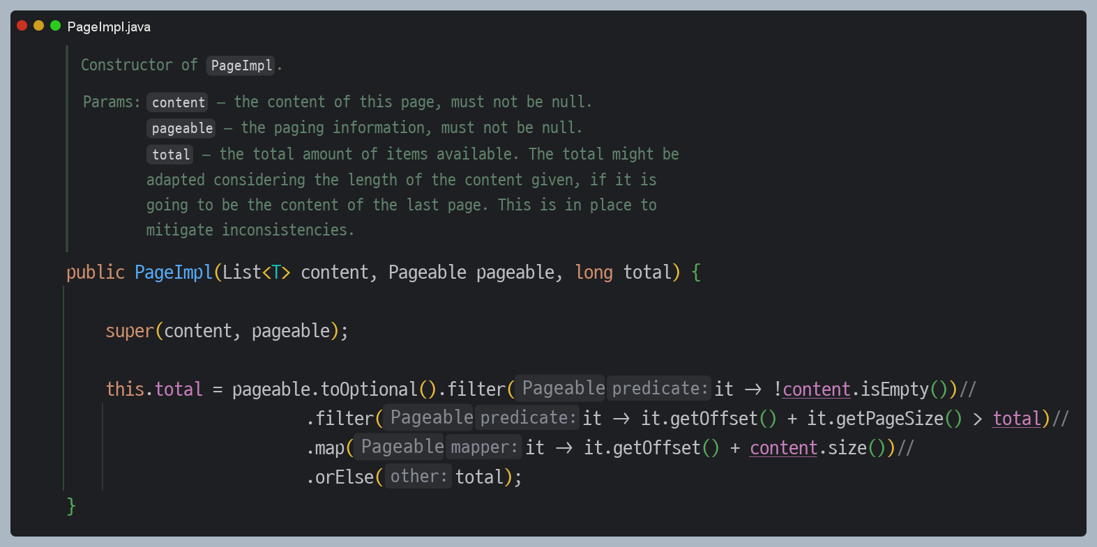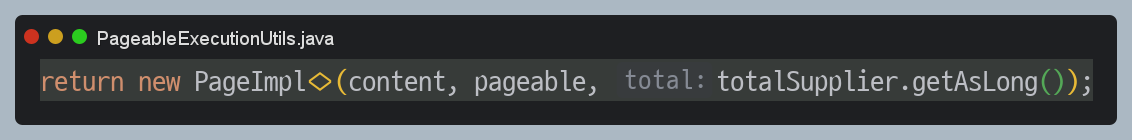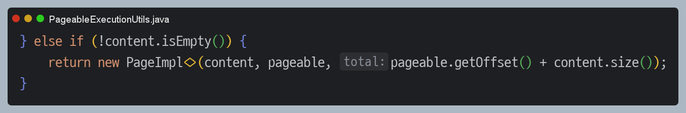 `PageImpl`의 생성자도 살펴보았는데 특이한 부분이 있었습니다. 전달받은 `total`을 그대로 사용하지 않고 무언가 추가적인 계산을 하는 것입니다.