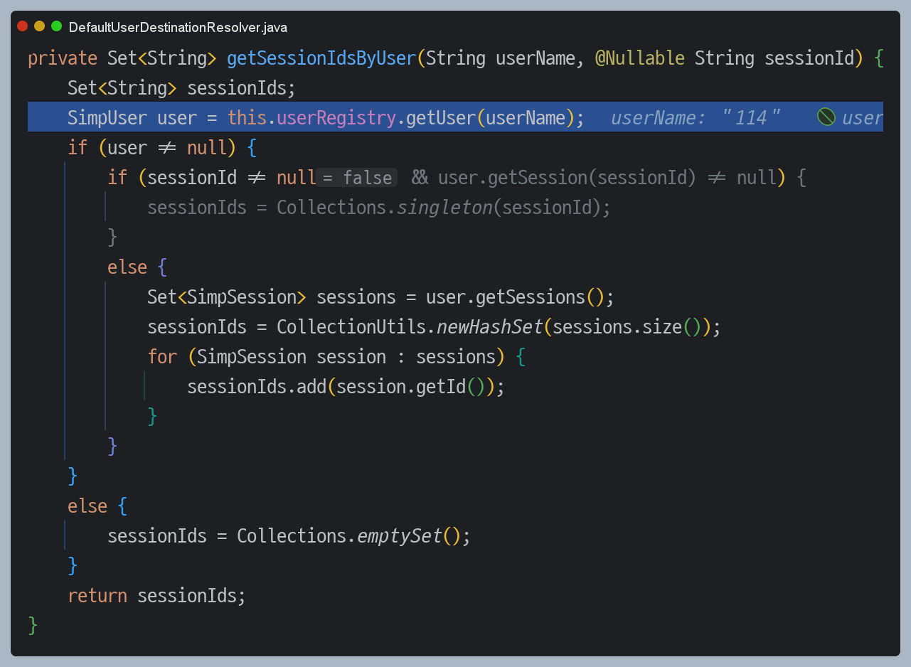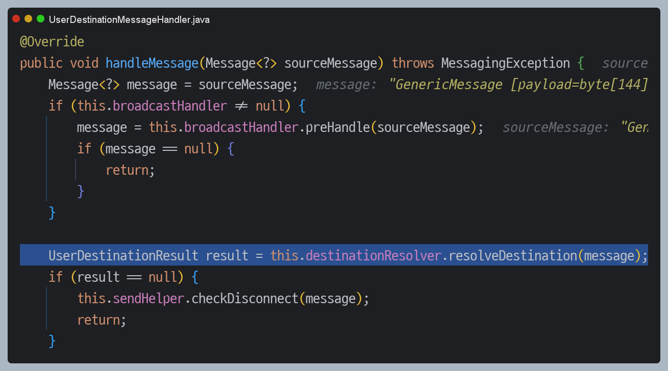 이제는 `DefaultSimpUserRegistry`에서 세션에 해당하는 user 정보를 가져올 수 있기 때문에 `UserDestinationMessageHandler`에서 이후 로직을 정상적으로 처리할 수 있습니다.