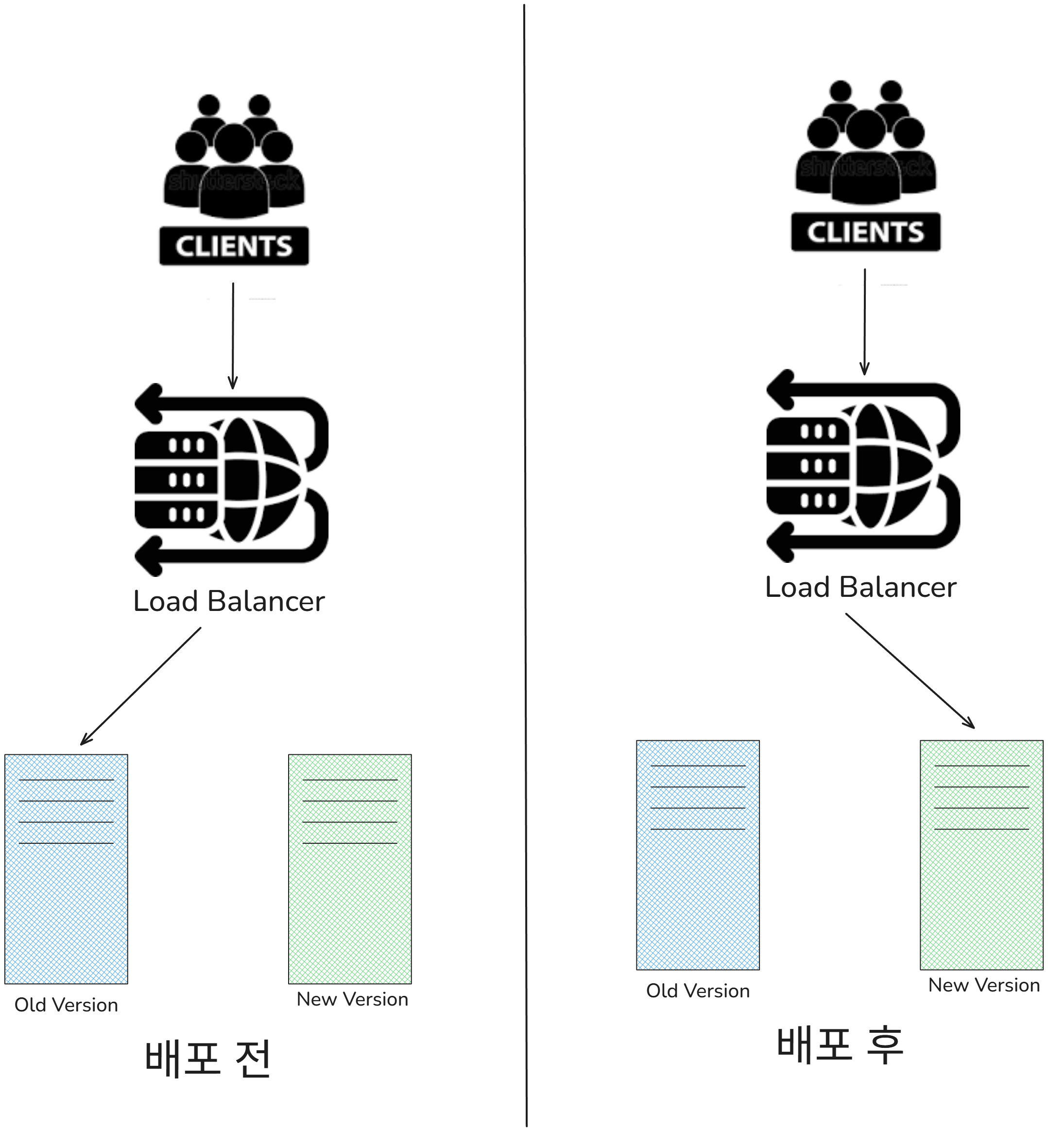 Blue(구버전)와 Green(버전) 두 환경을 준비해, 새 버전이 완전히 준비되면 트래픽을 한 번에 Green으로 전환하는 방식입니다.