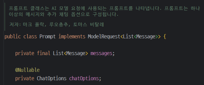 `Prompt` 클래스는 Spring AI에서 모델에 보낼 메시지와 모델 파라미터 옵션(`ChatOptions`)을 감싸는 역할을 합니다.