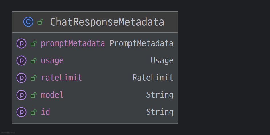 `ChatResponse` 응답 객체 안에는 모델의 출력 메시지 외에도 사용된 프롬프트, 모델 파라미터, 응답 시간 등의 메타 정보도 포함되어 있어서, 후처리나 로깅, 디버깅 시에도 유용하게 활용할 수 있습니다.