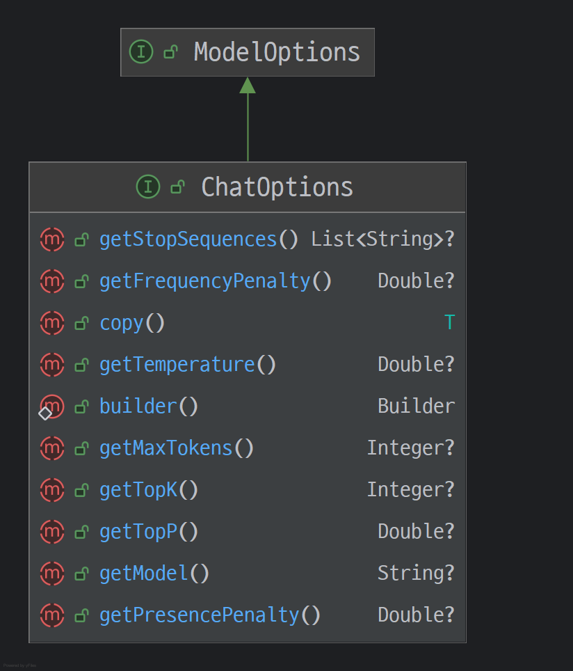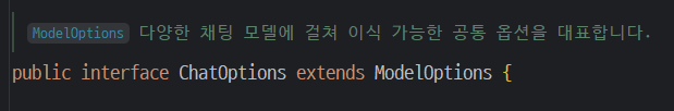 `ChatOptions`는 LLM 호출 시 사용할 다양한 파라미터를 정의한 인터페이스로, 대부분의 LLM에서 공통으로 사용될 수 있는 옵션들만 포함하고 있습니다.