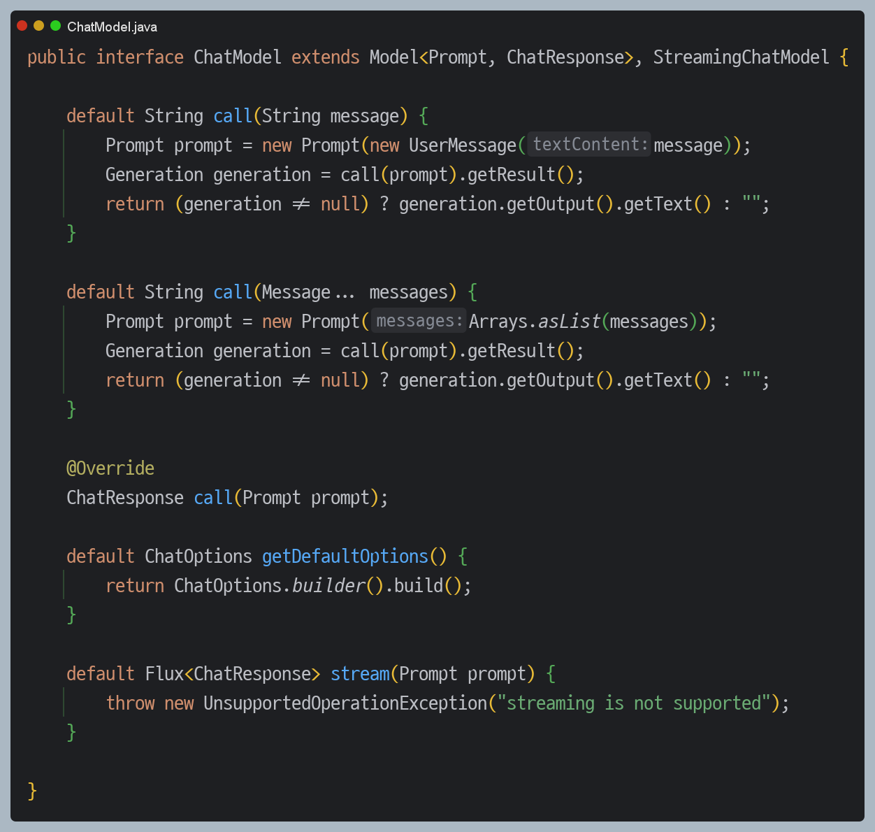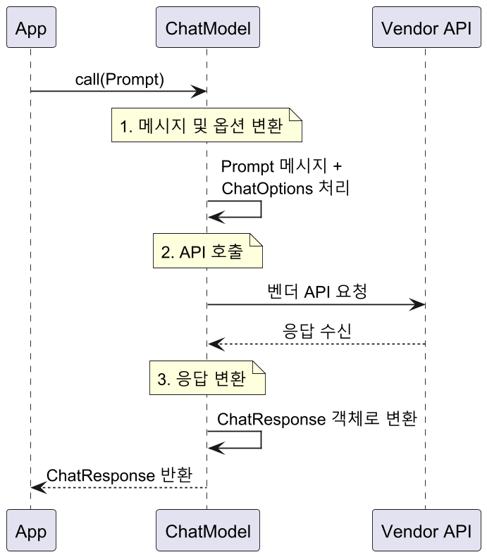 `ChatModel`은 LLM과의 기본적인 상호작용을 담당하는 인터페이스로, Spring AI 동작의 기반이 되는 핵심 컴포넌트입니다.