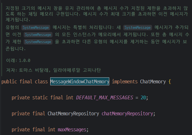 `MessageWindowChatMemory` 클래스의 Javadoc을 보면 다음과 같이 설명되어 있습니다.