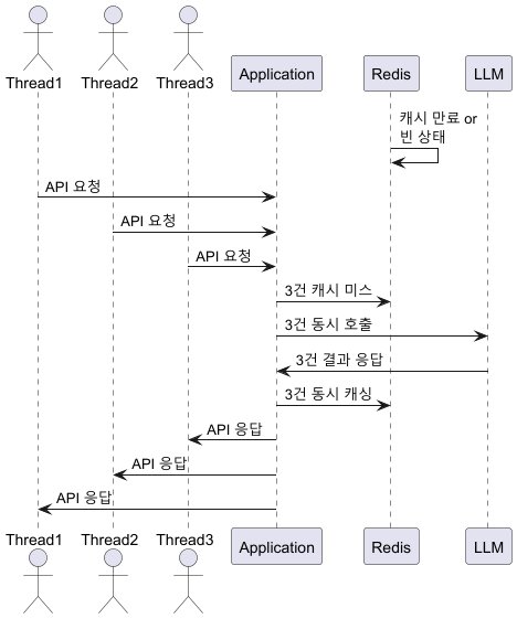`캐시 미스 횟수 = LLM 호출 횟수`이기 때문에 50번에서 10번으로 줄은 것은 기대한 대로 동작하였습니다. 하지만 캐시 미스가 10번 발생한 것에 의문을 가졌습니다. 이왕이면 첫 요청 한 번만 캐시 미스가 발생해 LLM을 호출해 캐싱하고, 이후 나머지 요청은 캐시값을 사용하는 구조를 만들 수 있으면 좋겠다고 생각했습니다.