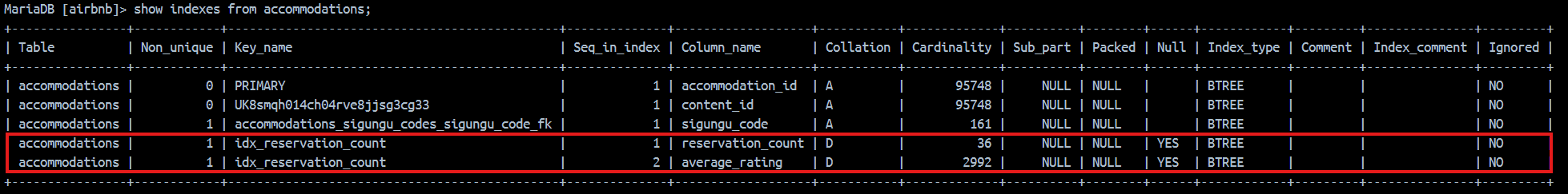 1번과 3번 문제를 해결하기 위해 반정규화를 해보겠습니다. 기존 쿼리의 문제점이 항상 예약과 후기 테이블을 조인해서 숙소의 예약 수, 평균 평점과 같은 집계를 수행하는 것이었습니다. 이를 반정규화로 조인 및 임시 테이블 정렬 비용을 줄이기 위해 기존 숙소 테이블에 다음 필드를 추가했습니다.