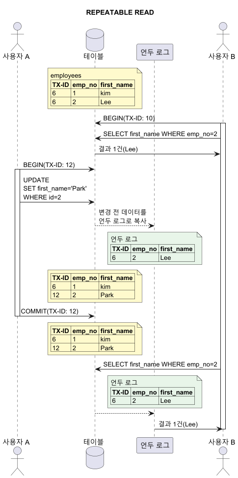 `REPEATABLE READ` 격리 수준은 다음 시퀀스 다이어그램과 같이 작동합니다.