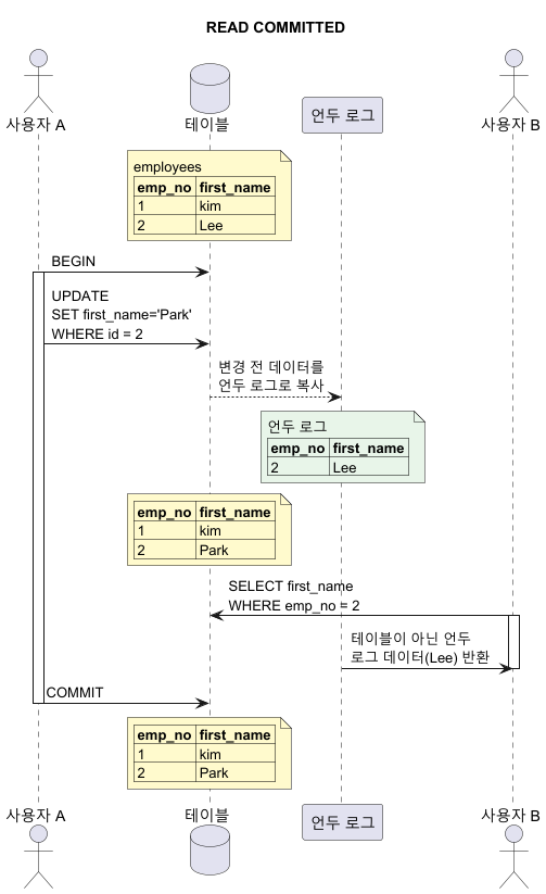 사용자 B는 `select` 쿼리 결과를 테이블이 아니라 언두 영역에 백업된 레코드에서 가져옵니다. `READ COMMITTED` 격리 수준에서는 어떤 트랜잭션에서 변경한 내용이 커밋되기 전까지는 다른 트랜잭션에서 그러한 변경 내역을 조회할 수 없기 때문입니다. 사용자 A가 변경된 내용을 커밋하면 그때부터는 다른 트랜잭션에서도 백업된 언두 레코드가 아니라 새롭게 변경된 테이블에서 값을 읽게 됩니다.