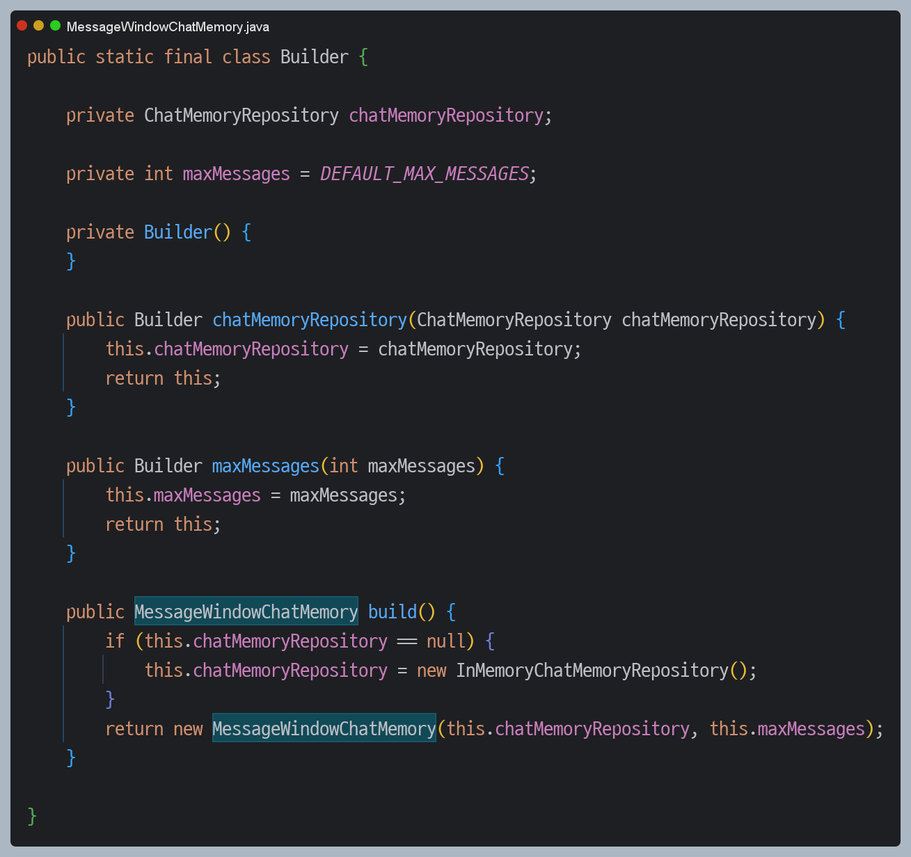 return MessageWindowChatMemory.builder().build();