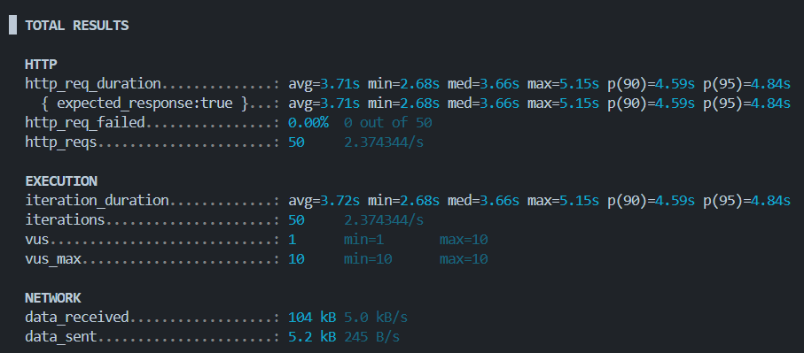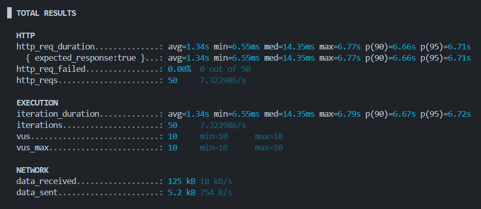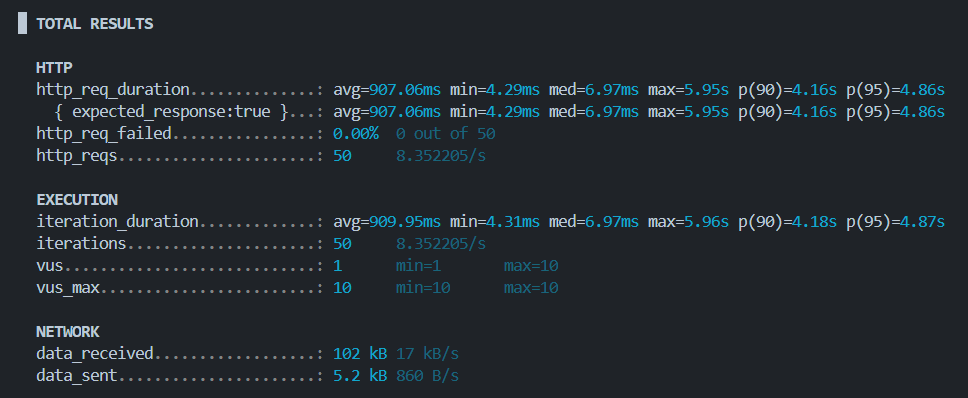 이제 k6로 캐싱 전후의 캐시 적중률을 비교해 보겠습니다. 스크립트는 다음과 같이 10명의 사용자가 5번씩 동시에 요청을 보내는 간단한 시나리오를 구성했습니다.