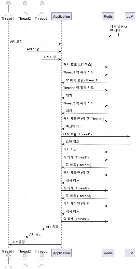 락을 적용했을 때 주의할 점은 `log.info("캐시 히트 (락 후): ...")` 부분의 if문이었습니다. 현재 스레드가 락을 획득하는 시간에 다른 스레드가 이미 락을 획득하여 먼저 캐싱을 했을 가능성도 고려를 해야 합니다. 즉 락을 획득했다고 해서 무조건 LLM/DB를 불러오는 게 아닌 한번 더 동시 상황을 Double-Check 하는 것입니다.