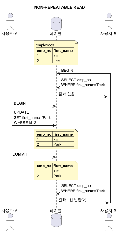 사용자 B는 똑같은 두 번의 똑같은 `SELECT` 쿼리를 실행했을 때 결과가 각각 다릅니다. 정상적인 상황처럼 보이지만, 하나의 트랜잭션 내에서 똑같은 `SELECT` 쿼리를 실행했을 때는 항상 같은 결과를 가져와야 한다는 `REPEATABLE READ` 정합성에 어긋나게 됩니다.